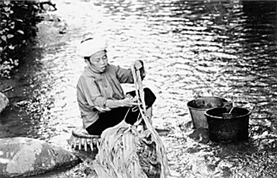 2005年8月13日,“臨滄傣族構皮手工造紙工藝”調查組一行5人從臨滄出發,赴耿馬傣族佤族自治縣孟定鎮和永德縣永康鎮進行實地調查。臨滄傣族構皮手工造紙工藝保存得最完整的主要是孟定鎮芒團村和永康鎮忙石寨兩個地方。我們進入忙團村時,正值天氣晴朗、太陽高照,村里許多人家的場院里都擺放著紙簾子在曬新紙。孟定鎮文化站的金紫明同志將我們帶到常年四季都造紙的玉勐嘎家。在61歲的玉勐嘎家里,我們親眼看見了古法手工造紙的完整過程。