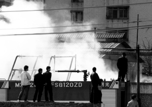 記者趕到事發現場時,陣陣濃煙從廣州市華泰紙業有限公司與廣州市和宜有限公司共有的后院中冒了出來。記者站在起火院外對面的圍墻上看到,院內存滿了紙片,該廠的員工與消防隊員正站在高處對著表面已燃成焦炭的紙片堆上噴射水流。大約半小時后,紙堆內已無明顯濃煙冒出,消防車才逐輛撤離現場。記者從廠內的員工處了解到,起火院落內是兩家公司存放廢舊紙板的地方,旁邊基本沒有火源,不知為何竟燒著了。
