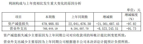 如上圖所示,公司的“資產(chǎn)減值損失”和“營(yíng)業(yè)外支出”都比去年同期大幅減少,減少額度高達(dá)3008.49萬元。特別是“資產(chǎn)減值損失”,其減少額度達(dá)到了2156.17萬元。