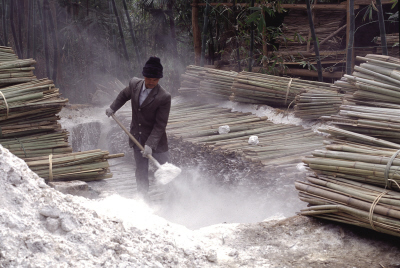 刷:把竹料疊排放進(jìn)腌塘中,投入礪灰進(jìn)行腌制。腌制就是去除竹料中的木質(zhì)素,提純植物纖維。紙農(nóng)叫這種腌制的竹料為“刷”。“刷”在腌塘中浸泡期間要上下翻動,使腌制均勻,這叫翻塘。“刷” 漚熟了要從腌塘中撈起,曬干備用。
