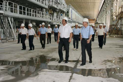 陳章良深入金桂年產60萬噸高檔紙板項目建設現場,聽取了造紙車間各工段介紹以及造紙工藝流程,詢問了進口設備的運輸、安裝等情況,對金桂紙機的建設規模做了了解,陳章良表示,金桂紙機的規模宏大,氣勢壯觀,企業要抓緊推進項目建設,政府要為企業加油鼓勁,創造有利條件,盡快實現投產目標,同時,自治區將繼續支持林漿紙一體化項目的原料林基地建設。