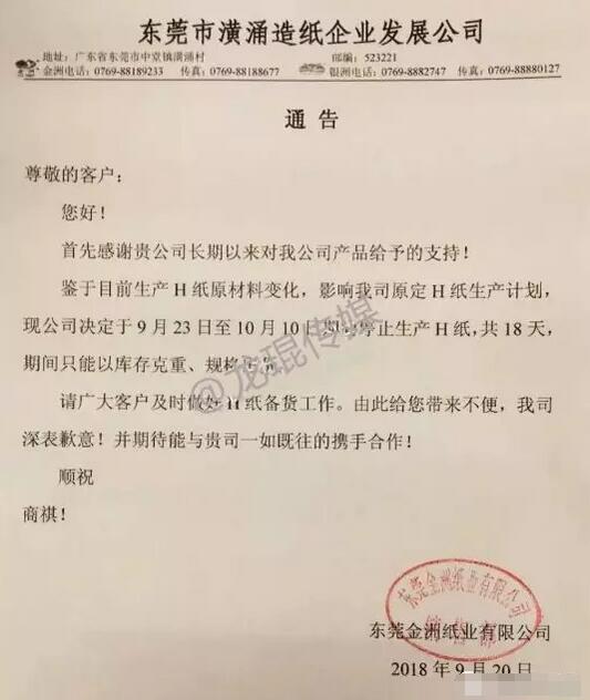 繼玖龍降價、富陽紙廠停限產(chǎn)之后,造紙行業(yè)又生波折。9月20日,東莞金洲紙業(yè)發(fā)出通知,宣稱鑒于目前生產(chǎn)H紙原材料變化,決定于9月23日至10月10日期間停止生產(chǎn)H紙,共18天,期間只能以庫存克重、規(guī)格出貨。