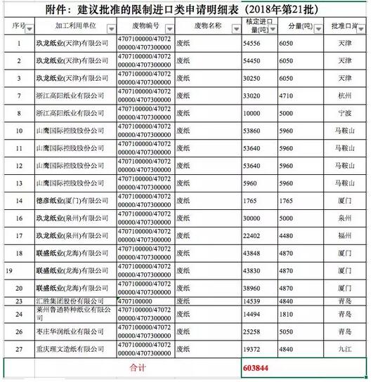 9月29日,中國固廢中心公布的2018年第21批限制進口許可證顯示,審核通過了玖龍紙業(天津)有限公司、浙江高陽紙業有限公司、山鷹國際控股有限公司、德彥紙業(廈門)有限公司、玖龍紙業(泉州)有限公司、聯盛紙業(龍海)有限公司、匯勝集團股份有限公司、萊州魯通特種紙業有限公司、棗莊華潤紙業有限公司、重慶理文造紙有限公司10家紙廠共獲核準總量為60.3844萬噸。