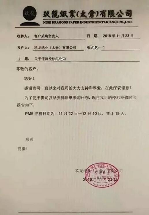 榮成跟漲50元/噸,今天起玖龍(泉州、太倉)、山鷹(安徽、浙江、福建)齊漲價 11月28日一大早,江蘇榮成環(huán)科股份有限公司(簡稱“榮成環(huán)科”)亦對外發(fā)布漲價通知。公司稱受原材料及其他綜合成本持續(xù)上漲影響,為維持貴我雙方長期友好合作,經(jīng)研究決定從2018年11月29日起,公司所有原紙紙種的售價統(tǒng)一上調(diào)50元/噸。