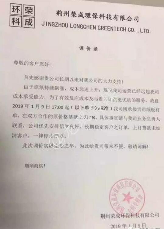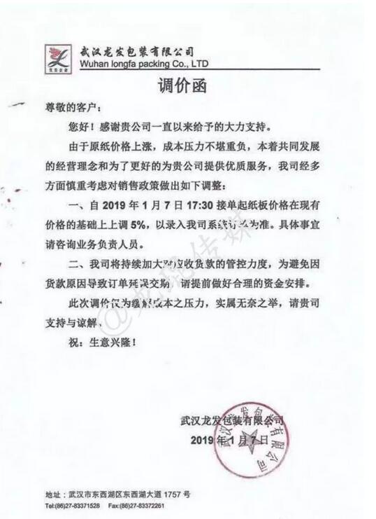 武漢龍發包裝有限公司 自2019年1月7日17:00接單起,紙板價格在現有基礎上上調5%。