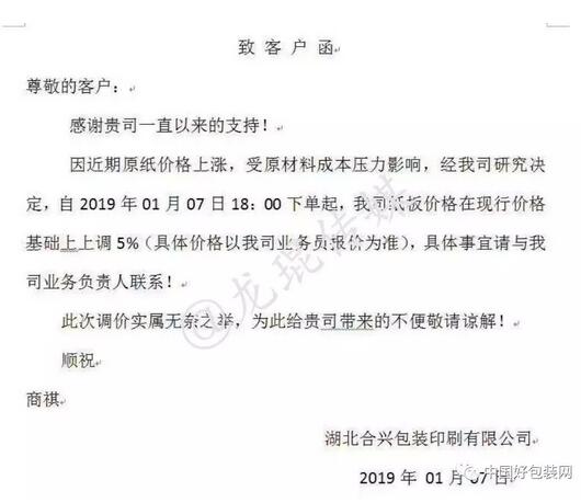 湖北合興包裝印刷有限公司 自2019年1月7日18:00下單起,紙板價格在現有基礎上上調5%。