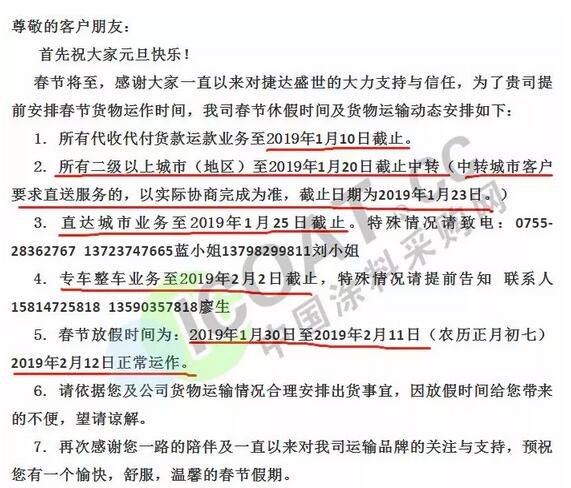 導語:年關將近,很多物流公司都陸續發布了2019年春節停運通知。大部分物流公司從1月20日起開始放假,部分甚至在1月10日、12日就停止收貨。有包裝廠也發出通知,春節將至,工廠放假,物流、運輸休息!要下單的老板們,抓緊啦!