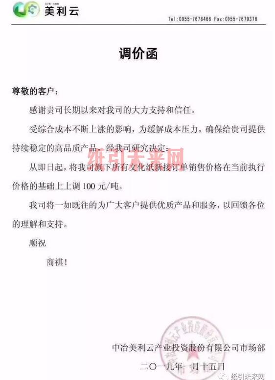 中治美利云產業投資股份有限公司:受綜合成本不斷上漲的影響,為緩解成本壓力,確保給貴司提供持續穩定的高品質產品,經我司研究決定:從即日起,將我司旗下所有文化紙新接訂單銷售價格在當前執行價格的基礎上上調100元/噸。