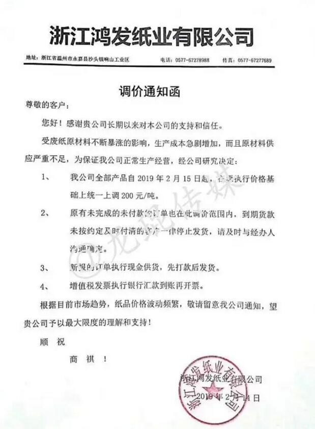 浙江鴻發(fā)紙業(yè)有限公司:自2019年2月15日起,成品紙價格在原供應(yīng)價格基礎(chǔ)上上調(diào)200元/噸,原有訂單也在此調(diào)價范圍內(nèi)。新報的訂單執(zhí)行現(xiàn)金供貨,先打款后發(fā)貨。