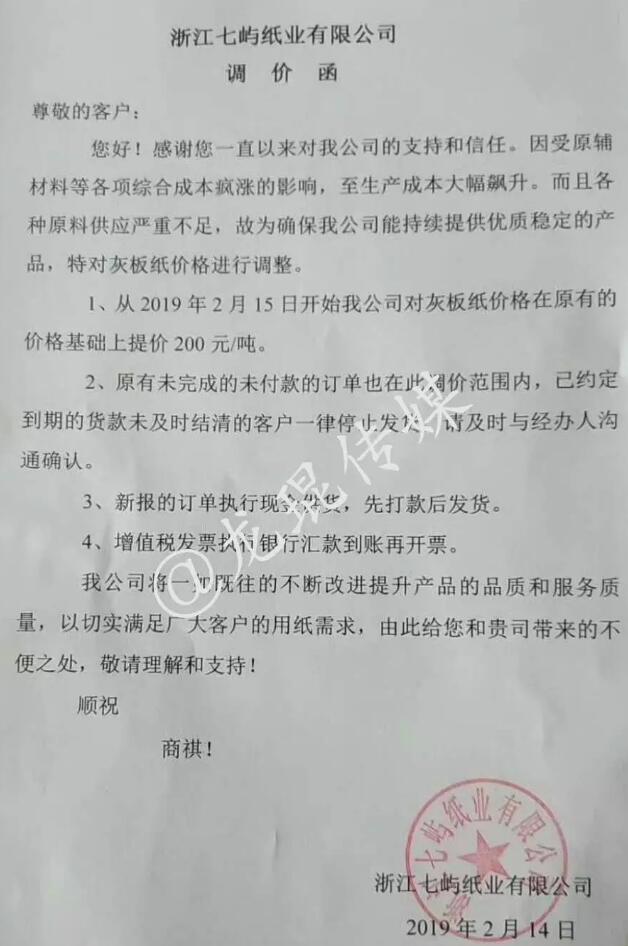 浙江七嶼紙業(yè)有限公司:自2019年2月15日起,灰板紙價格在原有價格基礎(chǔ)上提價200元/噸,原有未完成的未付款訂單也在此調(diào)價范圍內(nèi)。