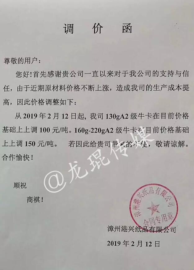 杭州金龍紙業(yè)有限公司:自2019年2月15日起,單面涂布白板紙在原有價格基礎(chǔ)上上調(diào)100元/噸,原有訂單也在此調(diào)價范圍內(nèi)。