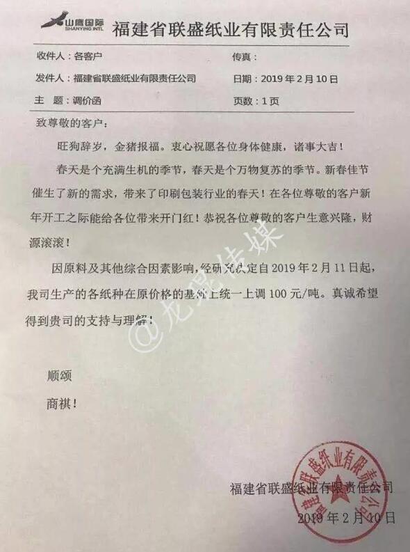 福建省聯(lián)盛紙業(yè)有限公司:自2019年2月11日起,各紙種在原價格基礎(chǔ)上統(tǒng)一上調(diào)100元/噸。