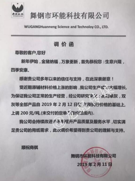 舞鋼市環(huán)能科技有限公司:自2019年2月12日起,在原執(zhí)行價格基礎(chǔ)上上調(diào)200元/噸。