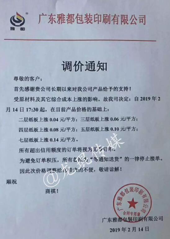 廣東雅都包裝印刷有限公司:自2019年2月14日17:30起,二層紙板上漲0.04元/平方,三層紙板上漲0.06元/平方,四層紙板上漲0.08元/平方,五層紙板上漲0.10元/平方,七層紙板上漲0.14元/平方,所有超出信用額度的訂單均視為無效訂單。