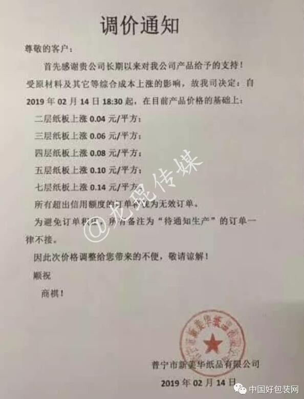 普寧市新美華紙品有限公司:自2019年2月14日下午18:30起,二層紙板上漲0.04元/平方,三層紙板上漲0.06元/平方,四層紙板上漲0.08元/平方,五層紙板上漲0.10元/平方,七層紙板上漲0.14元/平方,所有超出信用額度的訂單均視為無效訂單。