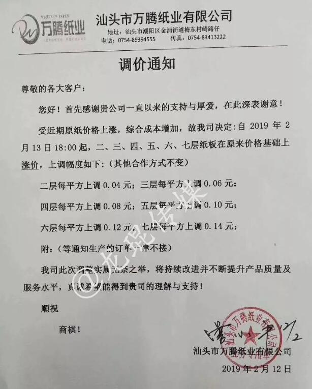 汕頭市萬騰紙業(yè)有限公司:自2月13日18點起,二層每平方上調(diào)0.04元,三層每平方上調(diào)0.06元,四層每平方上調(diào)0.08元,五層每平方上調(diào)0.10元,六層每平方上調(diào)0.12元,七層每平方上調(diào)0.14元,待通知生產(chǎn)的訂單一律不接。