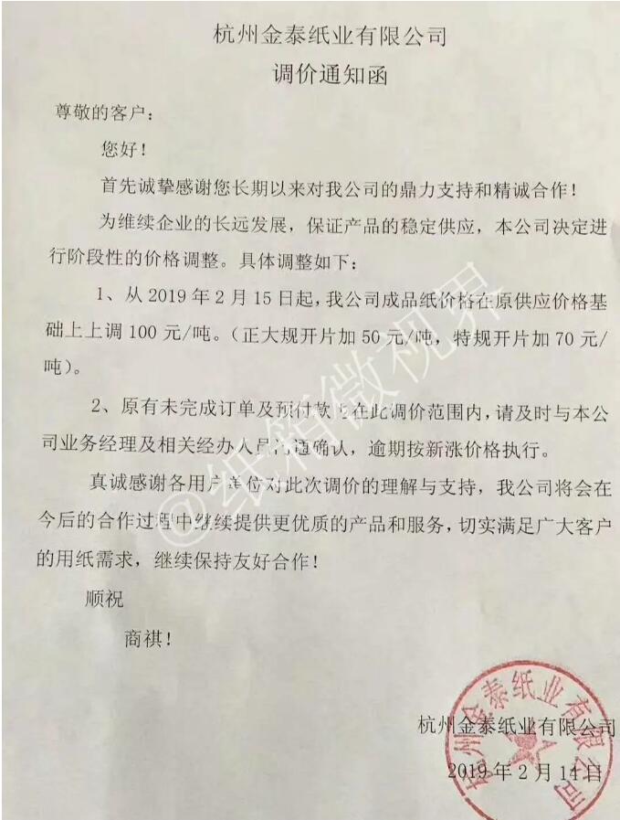 15家紙廠發布漲價函暴漲200元/噸,部分紙廠一律款到發貨 2月14日,杭州金泰紙業有限公司發布漲價函: 自2019年2月15日起,成品紙價格在原供應價格基礎上上調100元/噸(正大規開片加50元/噸,特規開片加70元/噸)。 原有未完成訂單及預付款在此調價范圍內。