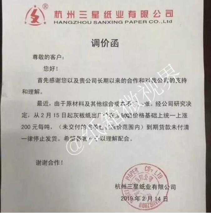 2月14日,杭州三星紙業有限公司發布漲價函: 自2019年2月15日起,灰板紙出廠價在原價格基礎上統一上漲200元/噸。 未交付的訂單在漲價范圍內。 到期貨款未付清一律停止發貨。