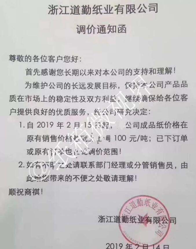 2月14日,浙江道勤紙業有限公司發布漲價函: 自2019年2月15日起,成品紙價格在原有銷售基礎上上調100元/噸。 已下訂單或原有訂單也在此調價范圍內。