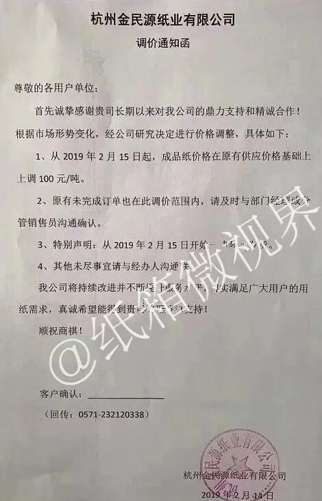 2月14日,杭州金民源紙業有限公司發布漲價函: 自2019年2月15日起,成品紙價格在原供應價格基礎上上調100元/噸。 原有未完成訂單也在此次調價范圍內。 特別聲明:從2019年2月15日開始一律款到發貨。