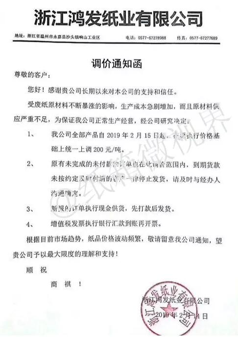 2月14日,浙江鴻發紙業有限公司發布漲價函: 自2019年2月15日起,成品紙價格在原供應價格基礎上上調200元/噸。 原有未完成的未付款的訂單也在此調價范圍內,到期貨款未按約定及時付清的客戶一律停止發貨。 新報的訂單執行現金供貨,先打款后發貨。