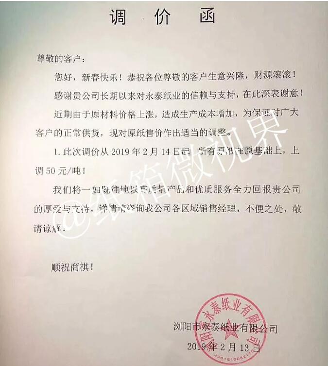 2月13日,瀏陽市永泰紙業有限公司發布漲價函: 自2019年2月14日,所有原紙在原基礎上,上調50元/噸。
