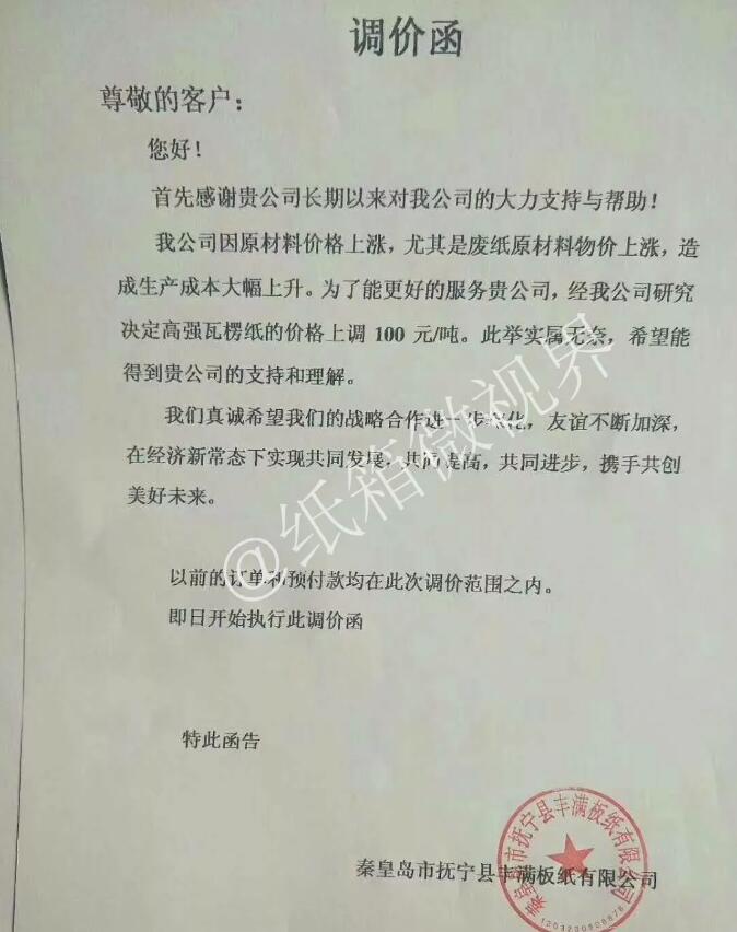 2月12日,秦皇島撫寧市豐滿紙板有限公司發布漲價函: 自2019年2月12日起,高強瓦楞紙的價格上調100元/噸。