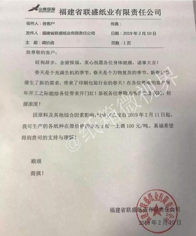 2月10日,福建省聯盛紙業有限公司發布漲價函: 自2019年2月11日起,各紙種在原價格基礎上統一上調100元/噸。