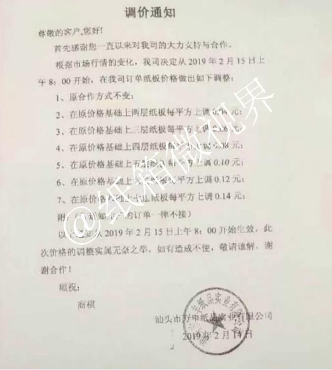 5家紙板廠發漲價函,部分漲0.14元/平,等通知生產訂單一律不接 2月14日,汕頭市萬中紙業有限公司發布漲價函: 自2019年2月15日上午8:00起,在原價格基礎上: 兩層紙板每平方上調0.04元 三層紙板每平方上調0.06元 四層紙板每平方上調0.08元 五層紙板每平方上調0.10元 六層紙板每平方上調0.12元 七層紙板每平方上調0.14元 等通知生產的訂單一律不接。