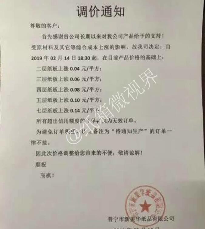 2月14日,揭陽市揭東嘉林紙品有限公司發布漲價函: 自2019年2月14日下午17:30起: 三層紙板上漲0.06元/平方 四層紙板上漲0.08元/平方 五層紙板上漲0.10元/平方 六層紙板上漲0.12元/平方 七層紙板上漲0.14元/平方 待通知生產的訂單一律不接。