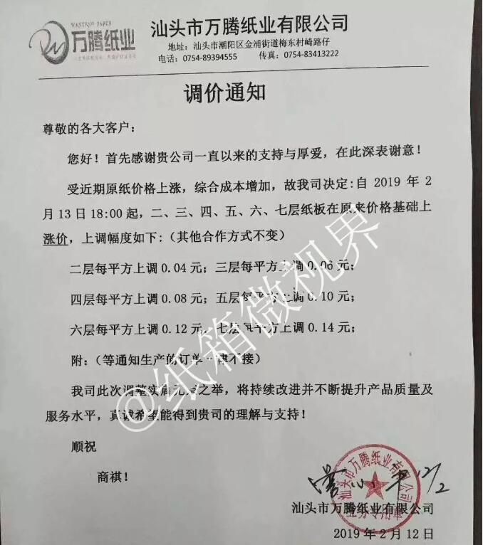 2月12日,汕頭市萬騰紙業有限公司發布漲價函: 自2月13日18點起: 二層每平方上調0.04元 三層每平方上調0.06元 四層每平方上調0.08元 五層每平方上調0.10元 六層每平方上調0.12元 七層每平方上調0.14元 待通知生產的訂單一律不接。