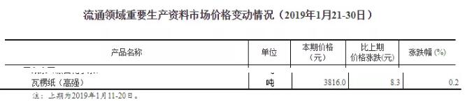 數據顯示,2019年1月21-30日,瓦楞紙價格為3816元/噸,較1月中旬增漲8.3元/噸,漲幅0.2%。 自此,從12月中旬以來,高強瓦楞紙已經連續4個統計周期微幅上調,本波價格也是國家統計局春節前公布的最后一次數據。