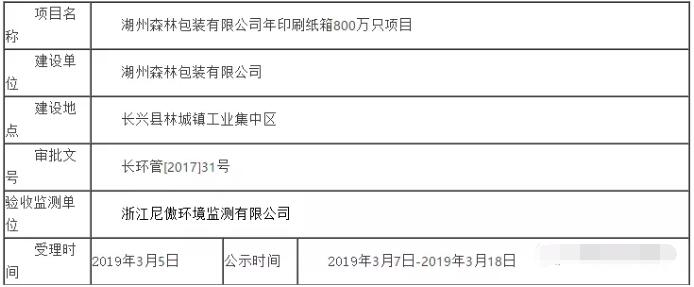 3月5日,浙江省湖州市長興縣環保局發布公告稱,將受理及擬批準湖州森林包裝有限公司年印刷紙箱800萬只項目的竣工環境保護階段性驗收申請。