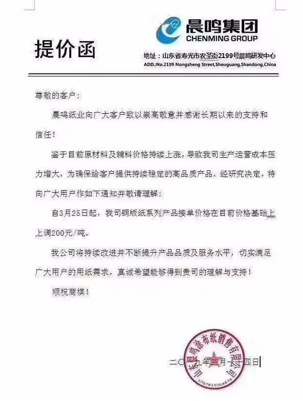 晨鳴紙業:自3月25日起,我司銅版紙系列產品接單價格在目前價格基礎上上調200元/噸。