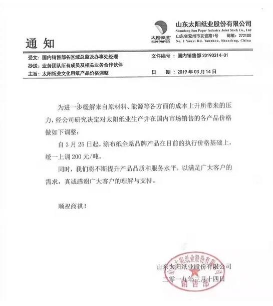太陽紙業:自3月25日起,涂布紙全系品牌產品在目前的執行價格基礎上統一上調200元/噸。