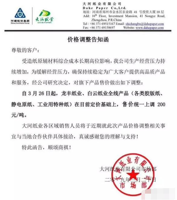 大河紙業有限公司:自3月26日起,龍豐紙業、白云紙業全線產品(各類膠版紙、靜電原紙、工業用特種紙)在目前定價基礎上,售價統一上調200元/噸。