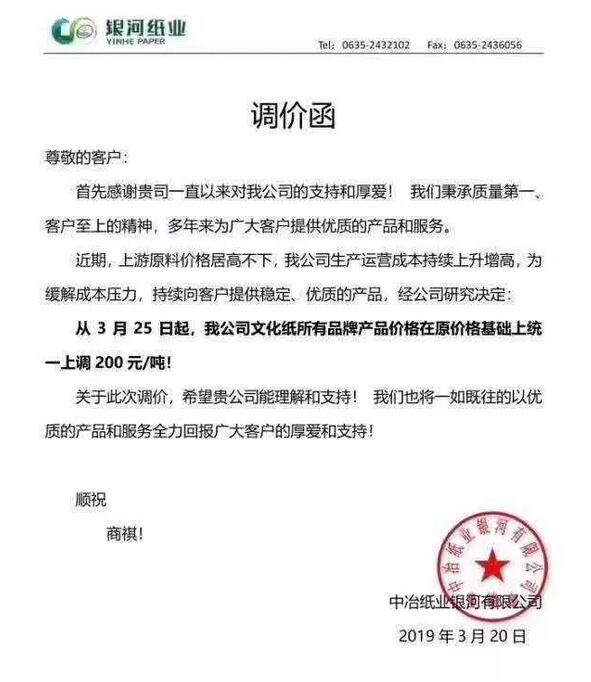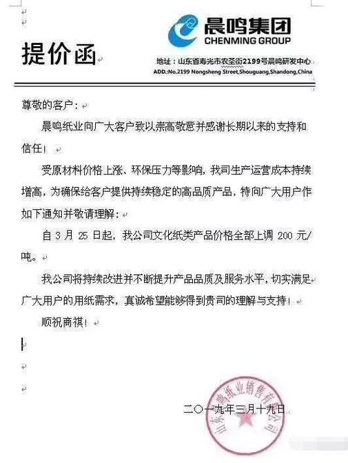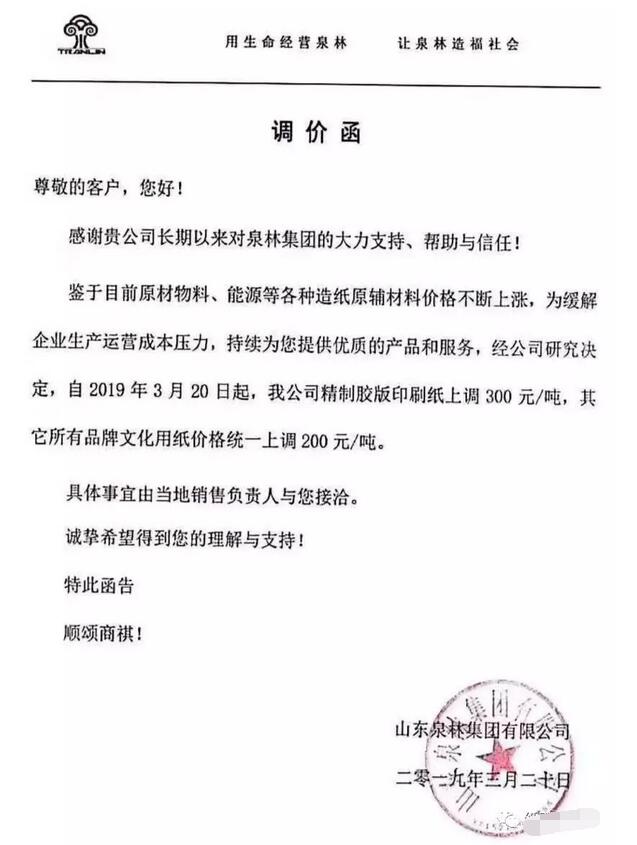 山東泉林集團有限公司:鑒于目前原材物料、能源等各種造紙原輔材料價格不斷上漲,為緩解企業生產運營成本壓力,持續為您提供優質的產品和服務,經公司研究決定,自2019年3月20日起,我公司精制膠版印刷紙上調300元/噸,其它所有品牌文化用紙價格統一上調200元/噸。