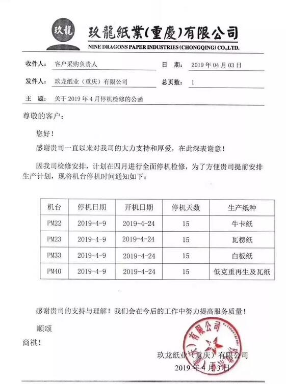 二、玖龍停機,多家紙廠漲價函齊現,最高上調100元/噸 玖龍紙業(重慶)有限公司 4月9日到4月24日,PM22、PM23、PM33、PM40停機15天,涉及的紙種分別是牛卡紙、瓦楞紙、白板紙、低克重再生及瓦紙。