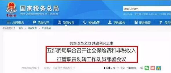 但有消息稱,從2019年1月1日起,機關事業單位養老保險和城鄉居民養老保險征收職能,先行移交至稅務部門管理,而企業養老保險征收職能目前將暫緩移交,留待有關配套政策和制度完善后,再行移交。