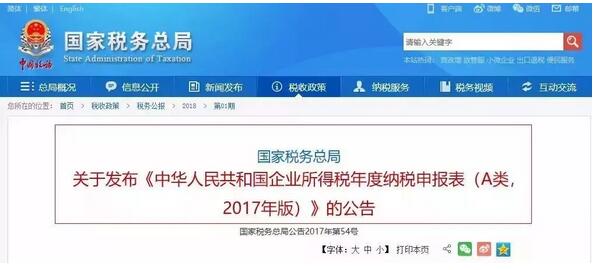 《國家稅務總局關于發布個人所得稅申報表的公告》(國家稅務總局公告2013年第21號)附件1至附件5、《國家稅務總局關于發布生產經營所得及減免稅事項有關個人所得稅申報表的公告》(國家稅務總局公告2015年第28號)附件1至附件3、《國家稅務總局關于全面實施新個人所得稅法若干征管銜接問題的公告》(國家稅務總局公告2018年第56號)附件1同時廢止。 匯算清繳:申報表大變! 企業所得稅年度納稅申報表(A類,2017年版)大改,匯算清繳18張申報表出現變化。