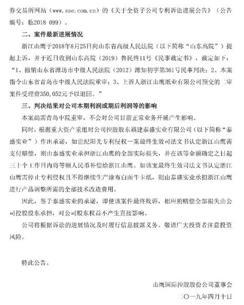 涉案專利摘要 2、鑒定機(jī)構(gòu)作出的《鑒定意見(jiàn)書(shū)》存在重大瑕疵; 3、原告世紀(jì)陽(yáng)光主張一億元賠償金額沒(méi)有事實(shí)依據(jù); 4、浙江山鷹和世紀(jì)陽(yáng)光均是購(gòu)買的維美德公司產(chǎn)品,維美德公司明確指出兩家公司的造紙?jiān)O(shè)備在壓榨部和涂布部技術(shù)方面存在區(qū)別,兩種技術(shù)在生產(chǎn)產(chǎn)品的工藝實(shí)現(xiàn)上并不相同; 5、浙江山鷹生產(chǎn)的產(chǎn)品依托的是簾式涂布機(jī),而世紀(jì)陽(yáng)光依托的是刮刀涂布機(jī),兩者生產(chǎn)的是不同的產(chǎn)品。 2018年8月,山東省濰坊市中級(jí)人民法院的一審民事判決書(shū)((2012)濰知初字第361號(hào))判決如下: 1、浙江山鷹、順發(fā)經(jīng)貿(mào)立即停止侵害涉案發(fā)明專利權(quán)的行為; 2、浙江山鷹于本判決生效之日起十日內(nèi),賠償原告李文君(原告“世紀(jì)陽(yáng)光”)經(jīng)濟(jì)損失及合理開(kāi)支共計(jì)6,165.0435萬(wàn)元; 3、順發(fā)經(jīng)貿(mào)在浙江山鷹賠償原告經(jīng)濟(jì)損失及合理開(kāi)支5萬(wàn)元范圍內(nèi)承擔(dān)連帶責(zé)任; 4、駁回世紀(jì)陽(yáng)光的其他訴訟請(qǐng)求; 2018年8月25日浙江山鷹向山東省高級(jí)人民法院提起上訴。 2019年4月10日浙江山鷹發(fā)布訴訟公告:近日收到山東高院(2019)魯民終11號(hào)《民事裁定書(shū)》,裁定如下: 1、撤銷山東省濰坊市中級(jí)人民法院(2012)濰知初字第361號(hào)民事判決; 2、本案指令山東省青島市中級(jí)人民法院重審; 3、上訴人浙江山鷹紙業(yè)有限公司預(yù)交的二審 附訴訟公告: