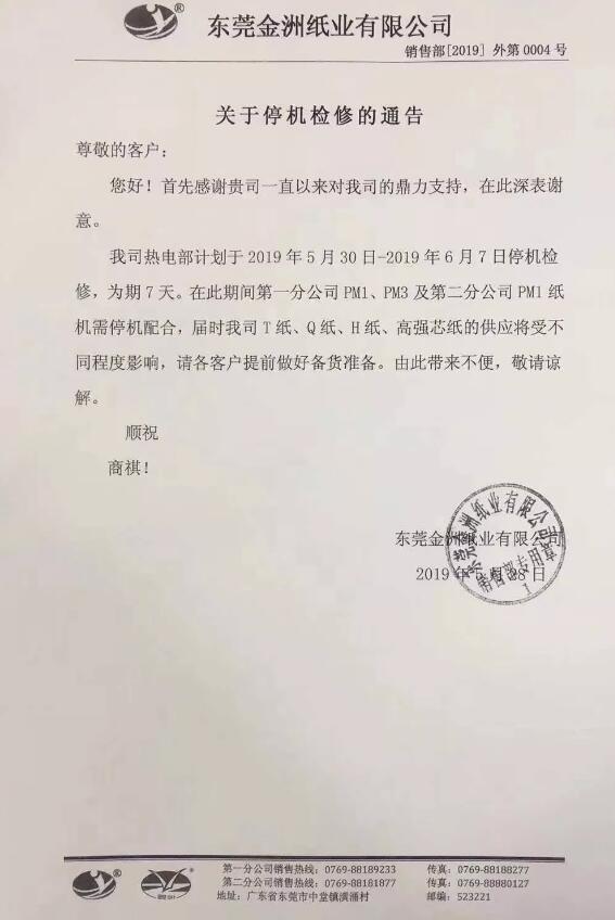 同樣,東莞地區也有三家紙廠:廣東東莞金洲紙業、廣東東莞中聯紙業、廣東東莞鴻業紙業計劃將于近日停機檢修,其中后兩家紙廠還表示“開機時間另行通知。” 東莞金洲紙業:熱電部計劃于2019年5月30日-2019年6月7日停機檢修,為期7天。在此期間,PM1、PM3及第二分公司PM1紙機需停機,T紙、Q紙、H紙、高強芯紙的供應將受到影響。