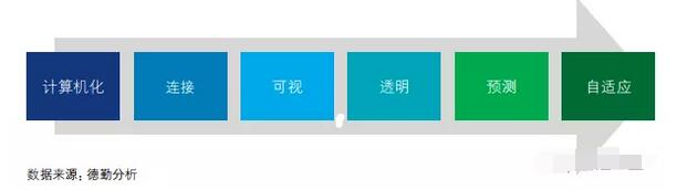▲ 工業4.0發展路徑 除了政府的支持,亞洲企業更積極打破行業壁壘加快新產品開發。不同于歐美同類企業,中國領先企業間的合作屢見不鮮,一些知名范例包括:百度與小米在物聯網與人工智能領域合作開發更多應用場景;騰訊與京東合作布局電子商務生態圈;印度系統集成商組成AI聯盟(如OpenAI)。這賦予它們驚人的影響力,也意味著它們擁有可用于快速推動創新的技術實力和資本基礎。 中國是亞洲智能化轉型的重要力量。政府加強智能制造頂層設計,開展試點示范和標準體系建設;企業加快數字化轉型,提升系統解決方案能力。中國智能制造取得明顯成效,進入高速成長期。 中國智能制造進入成長期主要體現在三方面:首先,中國工業企業數字化能力素質提升,為未來制造系統的分析預測和自適應奠定基礎。第二、財務效益方面,智能制造對企業的利潤貢獻率明顯提升。第三、典型應用方面,中國已成為工業機器人第一消費大國,需求增長強勁。 企業智能化的六大階段 企業數字化能力素質體現在其利用數據指導生產以及系統自優化的能力。我們借鑒國際普遍認可的工業4.0發展路徑,將企業智能化成熟度分為六個階段:計算機化、連接、可視、透明、預測和自適應。 計算機化 企業通過計算機化高效處理重復性工作,并實現高精度、低成本制造。但不同的信息技術系統在企業內部獨立運作,很多設備并不具備數字接口。 連接 相互關聯的環節取代各自為政的信息技術。操作技術(OT)系統的各部分 實現了連通性和互操作性,但是依舊未能達到IT層面和OT層面的完全整合。 可視 了解正在發生什么,通過現場總線和傳感器等物聯網技術,企業捕獲大量的實時數據,建立起企業的“數字孿生”,從而改變以前基于人工經驗的決策方式,轉為基于數字進行決策。 透明 了解事件發生的原因,并通過根本原因分析生成認識。 預測 將數字孿生投射到未來,模擬不同的情景對未來發展進行預測,并適時做出決策和采取適當措施。 自適應 預測能力只是自動化行為和決策的根本要求,而持續的自適應則使企業實現自主響應,以便其盡快適應變化的經營環境。 隨著中國兩化融合和工業物聯網建設等多項舉措推進,制造型企業數字化能力素質顯著提升,大部分企業正致力于數據縱向集成。德勤調研結果顯示,81%的受訪企業已完成計算機化階段,其中41% 處于連接階段,28%處于可視階段,9%處于透明階段,而預測和自適應階段的企業各自占2%。