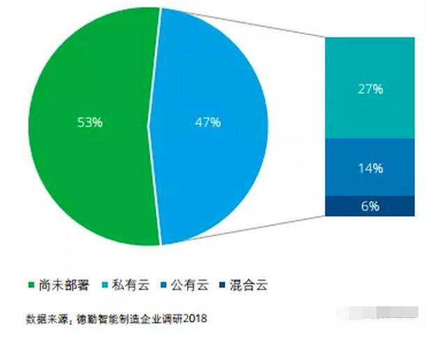 ▲ 受訪企業典型物聯網相關技術應用情況 感知僅是物聯網應用的初級階段,以數據洞察指導行動,從而提高效率,或者與服務交融創造新價值,才是物聯網的 核心。云平臺通過提供強大的數據傳 輸、存儲和處理能力,幫助制造企業采 集和處理大量數據。工業云平臺不僅能 夠實現企業通過平臺完成產品的設計、 工藝、制造、采購、營銷等環節,還將改變傳統生產方式和制造生態,創造新的收入來源和商業模式。中國制造企業云部署現狀如何? 德勤調研發現,中國制造企業云部署積極性不高。53%的受訪制造企業尚未部署工業云,47%的企業正在進行工業云部署,其中27%的企業部署私有云,14%部署公有云,6%部署混合云(見下圖)。上云可以大幅降低每個單元的儲存和計算成本,甚至通過跨界創造新的商業模式,但也帶來了復雜性。企業擔心一旦將諸如工廠生產過程、資產性能管理的數據放到 云平臺上之后,信息安全、知識產權問題會接踵而至。除此之外,很多企業尚未明 確工業云在企業層面的商業應用和相關能力欠缺也是導致企業云部署積極性不高的原因。 對于選擇公有云還是私有云,很大程度取 決于企業的關注點不同。如果企業只是 聚焦自己的生產制造,降本增效,往往不會選擇公有云;如果企業聚焦商業模式創 新和產品轉型,則會天然的更傾向于選擇公有云或混合云,因為往往涉及服務平臺,需要做到一定程度上的兼容和融合。由于目前國內比較常見的工業云的部署 以云的基礎功能為主,企業把云看作虛擬服務器,在云上做存儲、計算,只有少數企業通過云部署改變生產方式和制造生態,進行公有云和混合云部署的企業仍為少數。