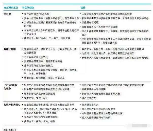 ▲ 受訪生產型企業工業云部署 未來企業很大部分增值將來自跨企業活動,從長遠看,公有云、混合云是大趨勢,因為只有這樣才能實現數據交換和資源共享。私有云雖然安全,但很可能被孤立在新的商業模式和新的生態圈之外。 —— 賀東東 樹根互聯CEO 德勤認為物聯網在智能制造領域的應用場景主要分為三類:設備與資產管理、產品洞察和服務創新。 管理設備與資產 具備感測與聯網功能的系統與大數據結合,可以實現設備的監控和管理,如遠程監控、預測性維護和互聯現場等。遠程監控以物聯網替代傳統的人工巡檢機制,通過傳感器遠距離將設備數據傳輸到運營中心。預測性維護打破傳統工廠 按計劃進行定期維護設備的運營方式, 通過物聯網對設備整個生命周期進行全程監控,并預測設備未來可能發生的故障,提前制定預防性維護計劃,減少故障率并提高生產效率。 物聯網還可以連接和監控廠房的工業裝置和設備,獲得有見解的分析,從而幫助跨工業設備、 生產線以及在整個工廠范圍內優化性能和效率。當然,除了新廠房,老廠房和設備在沒有更新換代之前,也有聯網監控的需要,如何在現有設備上進行物聯網改造是值得企業關注的問題。 洞察產品 制造企業往往不太了解自己的產品如何被使用,而物聯網將改變這一現狀。在產品投入使用后,制造廠商可以通過物 聯網與產品建立并保持聯系,收集動態數據,以更加系統的方式實時地持續地 分析產品使用情況。在了解客戶對產品的使用方式后,廠商還可以基于數據預測客戶需求,開發個性化產品和新的服務項目,提高產品附加值。 服務創新 基于數據和平臺提供后市場服務,物聯網 與服務交融實現商業模式創新。物聯網協助制造企業更有效捕捉和預測市場需求,創造動態化、個性化的智能服務、咨詢服務、數據服務、物聯網金融與保險 等新的服務種類。這類應用將打破企業原來的邊界,從全社會的維度思考制造資源的優化,客戶和制造端的互動以及各種商業模式的創新。 企業需要評估自身業務需要,明確商業目標、相關流程和預期結果的范圍,在考慮技術可擴展性、性能、帶寬經濟和技術創新等級后,才能對數據和物聯網系統的處理架構做出明智的選擇。 商業模式重構 智能制造不僅能夠幫助制造型企業實現降本增效,也賦予企業重新思考價值定位和重構商業模式的契機。同時,新進入者也在不斷挑戰傳統市場參與者的地位,眾多技術型企業加入戰場推動工業企業探索商業模式上的創新。 德勤調研發現企業對未來商業模式的規劃大致呈四類:30%的受訪企業未來商業模式將以平臺為核心,26%的企業走規模化定制模式,24%以“產品+服務”為核心向解決方案商轉型,12%以知識產權為核心(見下圖)。平臺型商業模式定位以提供多種軟件服務和搭建生態系統為核心,未來可能不會出現類似BAT這樣的行業巨頭,但不乏垂直行業領軍企業或平臺。 規模化定制模式,如C2M已經不局限于服裝制造,而延伸到汽車和裝備制造等行業。“產品+服務”為核心旨在圍繞客戶需求提供解決方案,是目前很多企業在做的。以知識產權為核心的企業往往通過專利戰略,形成技術壁壘占領市場。