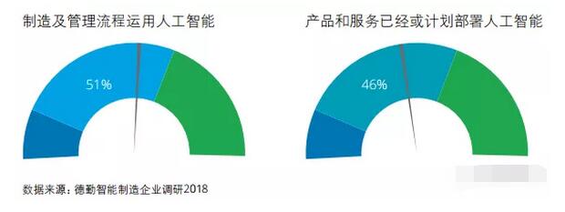 ▲ 不同商業模式特點及挑戰 人工智能顛覆制造和服務業 人工智能對制造業的影響主要來自兩方面: 一是在制造和管理流程中運用人工智能提高產品質量和生產效率;二是對現有產品與服務的徹底顛覆。 隨著國內制造業自動化程度提高,機器人在制造過程和管理流程中的應用日益泛,而人工智能更進一步賦予機器人自我學習能力。結合數據管理,導入自動化設備及相關設備的聯網,機器人通過機器學分析,可以實現生產線的精準配合,并更準確的預測和實時檢測生產問題。 人工智能在制造業產品和服務領域的應用則更具有顛覆性。產品本身就是人工智能的載體,硬件與各類軟件結合具備感知、判斷的能力并實時與用戶、環境互動。而產品的功能和服務,也將顛覆原有生態系統。以汽車產業為例,傳統汽車行業的競爭格局是金字塔型——整車廠處于頂端,各級別供應商跟隨其后。但是在智能汽車時代,整車廠的主導地位將受到嚴峻挑戰,零部件廠商、互聯網巨頭、算法公司、芯片制造商、傳感器供應商等企業無不加快對無人駕駛技術的研發和商業化步伐,并期望通過占據技術制高點 打破汽車產業的生態平衡。 中國制造企業人工智能應用情況如何? 德勤智能制造調研發現,51%的受訪企業在制造和管理流程中運用人工智能,46% 的受訪企業在產品和服務領域已經或計劃部署人工智能(見下圖)。制造和管理流程中人工智能的運用更偏向系統自動化和制造精益化,目的是提高生產效率和產品質量,同時人也被解放出來,可以去思考更復雜的問題。主要應用場景包括使用機器人實現流程自動化、柔性制造、定制化生產、質量檢測等。在產品和服務領域人工智能的運用更側重產品和服務與使用者的互動,典型應用包括研發和新品測試、用戶行為分析、自動駕駛等。