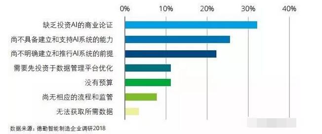 ▲ 受訪企業人工智能應用及部署情況(整體) 當然人工智能仍處在其發展早期,技術突破及商業論證需要更長時間。另外,人工智能應用環境和基礎設施的完善程度,信息和安全法規、企業自身的能力都成為企業面臨的主要挑戰。我們發現,對于尚未部署人工智能的制造企業來說,缺乏投資人工智能的商業論證、尚不具備建立和支持人工智能的系統能力、尚不明確部署人工智能的前提為主要挑戰(見下圖)。