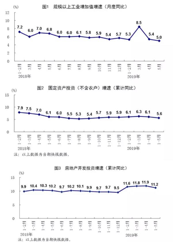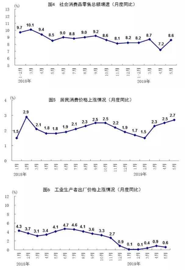 5月份國民經濟繼續運行在合理區間 (2019年6月14日) 國家統計局 5月份,各地區各部門以習近平新時代中國特色社會主義思想為指導,認真貫徹落實黨中央、國務院各項決策部署,堅持穩中求進工作總基調,統籌穩增長、促改革、調結構、惠民生、防風險、保穩定,堅持推動經濟高質量發展,扎實推進供給側結構性改革,凝心聚力、攻堅克難,國民經濟繼續運行在合理區間,延續總體平穩、穩中有進的發展態勢。 一、服務業持續增長,新興服務業深入發展 5月份,全國服務業生產指數同比增長7.0%,增速比上月回落0.4個百分點。1-5月份,全國服務業生產指數同比增長7.3%,比1-4月份回落0.1個百分點,與1-2月份持平。5月份,信息傳輸、軟件和信息技術服務業,租賃和商務服務業同比分別增長22.2%和8.4%,增速分別快于全國服務業生產指數15.2和1.4個百分點。服務業商務活動指數53.5%,比上月上升0.2個百分點,繼續保持在榮枯線以上;鐵路運輸業、航空運輸業、郵政業、住宿業、電信廣播電視和衛星傳輸服務、互聯網軟件信息技術服務等行業商務活動指數均位于60.0%以上的較高景氣區間。服務業業務活動預期指數為59.5%,處于較高水平。 二、工業生產穩中有增,高技術制造業較快增長 5月份,全國規模以上工業增加值同比增長5.0%,增速比上月回落0.4個百分點。1-5月份,全國規模以上工業增加值同比增長6.0%,增速比1-4月份回落0.2個百分點。分經濟類型看,5月份,國有控股企業增加值同比增長3.7%,股份制企業增長6.6%,外商及港澳臺商投資企業下降0.3%。分三大門類看,采礦業增加值同比增長3.9%,制造業增長5.0%,電力、熱力、燃氣及水生產和供應業增長5.9%。高技術制造業增加值同比增長9.4%,比規模以上工業快4.4個百分點;新能源汽車、太陽能電池產量同比分別增長16.0%和9.9%。5月份,制造業采購經理指數(PMI)分項指數中,生產指數和供應商配送時間指數分別為51.7%和50.9%,均高于臨界點。 三、市場銷售增速加快,網上零售占比繼續提高 5月份,社會消費品零售總額32956億元,同比增長8.6%,增速比上月加快1.4個百分點。按經營單位所在地分,城鎮消費品零售額28304億元,同比增長8.5%;鄉村消費品零售額4652億元,增長9.0%。按消費類型分,餐飲收入3631億元,增長9.4%;商品零售29324億元,增長8.5%。限額以上單位化妝品類、飲料類、日用品類、中西藥品類商品零售額同比分別增長16.7%、12.7%、11.4%和11.2%,分別快于社會消費品零售總額8.1、4.1、2.8和2.6個百分點。 1-5月份,社會消費品零售總額161332 億元,同比增長8.1%,增速比1-4月份加快0.1個百分點。全國網上零售額38641億元,同比增長17.8%,增速與1-4月份持平,比1-3月份加快2.5個百分點。其中,實物商品網上零售額30415億元,增長21.7%,占社會消費品零售總額的比重為18.9%,比1-4月份和1-3月份分別提高0.3和0.7個百分點,比上年同期提高2.3個百分點。 四、投資保持增長,高技術產業投資增勢良好 1-5月份,全國固定資產投資(不含農戶)217555億元,同比增長5.6%,增速比1-4月份回落0.5個百分點。其中,民間投資130823億元,增長5.3%。分產業看,第一產業投資同比下降2.3%;第二產業投資增長3.2%,其中制造業投資增長2.7%,比1-4月份加快0.2個百分點;第三產業投資增長7.1%,其中基礎設施投資增長4.0%。高技術產業投資較快增長,高技術制造業和高技術服務業投資同比分別增長10.2%和15.6%,增速分別快于全部投資4.6和10.0個百分點。1-5月份,全國房地產開發投資46075億元,同比增長11.2%,增速比1-4月份回落0.7個百分點,比上年全年加快1.7個百分點。全國商品房銷售面積55518萬平方米,同比下降1.6%;全國商品房銷售額51773億元,同比增長6.1%。 五、就業形勢總體穩定,調查失業率持平 1-5月份,全國城鎮新增就業597萬人,完成全年計劃的54%。5月份,全國城鎮調查失業率為5.0%,與上月持平。其中,25-59歲人口調查失業率為4.5%,比上月下降0.2個百分點,連續三個月下降。31個大城市城鎮調查失業率為5.0%,與上月持平。全國企業就業人員周平均工作時間為46.3小時,同比增加0.5個小時。 六、居民消費價格漲勢溫和,工業生產者價格漲幅回落 5月份,全國居民消費價格同比上漲2.7%,漲幅比上月擴大0.2個百分點,環比持平。分類別看,食品煙酒價格同比上漲5.8%,衣著上漲1.7%,居住上漲1.8%,生活用品及服務上漲1.0%,交通和通信下降0.9%,教育文化和娛樂上漲2.6%,醫療保健上漲2.5%,其他用品和服務上漲2.1%。扣除食品和能源價格后的核心CPI上漲1.6%,漲幅比上月回落0.1個百分點。1-5月份,全國居民消費價格同比上漲2.2%。 5月份,全國工業生產者出廠價格同比上漲0.6%,漲幅比上月回落0.3個百分點,環比上漲0.2%。全國工業生產者購進價格同比上漲0.2%,環比持平。1-5月份,全國工業生產者出廠價格和全國工業生產者購進價格同比分別上漲0.4%和0.2%。 七、出口保持較快增長,貿易結構不斷優化 5月份,進出口總額25925億元,同比增長2.9%。其中,出口14358億元,增長7.7%;進口11567億元,下降2.5%。進出口相抵,貿易順差2791億元,同比擴大89.8%。1-5月份,進出口總額121041億元,同比增長4.1%。其中,出口64987億元,增長6.1%;進口56053億元,增長1.8%。貿易方式結構進一步優化。1-5月份,一般貿易進出口同比增長6.1%,占進出口總額的比重為59.9%,比上年同期提高1.1個百分點。民營企業進出口增長11.1%,占進出口總額的比重為41.4%,比上年同期提高2.6個百分點。1-5月份,規模以上工業企業實現出口交