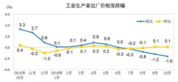 根據國家統計局的數據,2019年10月份,全國工業生產者出廠價格同比下降1.6%,環比上漲0.1%;工業生產者購進價格同比下降2.1%,環比上漲0.2%。1-10月平均,工業生產者出廠價格比去年同期下降0.2%,工業生產者購進價格下降0.5%。