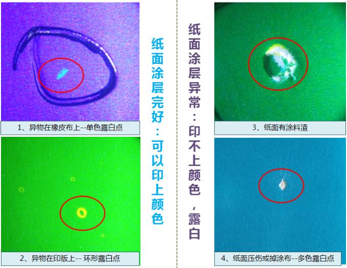 圖2:印刷掉點(diǎn)的常見(jiàn)形態(tài) 分類:按紙面涂層破損情況,分為涂層完好、涂層異常兩種。 查證:印刷過(guò)程中出現(xiàn)印刷掉點(diǎn)問(wèn)題后,我們需要找到剛出現(xiàn)掉點(diǎn)的第一張印樣上的點(diǎn)(稱之為原始點(diǎn),此張之后印刷的稱為轉(zhuǎn)印點(diǎn)),用肉眼或放大鏡查看紙面涂層是否損傷,以作初判。 02、印刷掉點(diǎn)的“點(diǎn)”是如何產(chǎn)生的? 首先,我們看看油墨轉(zhuǎn)移的必要條件: 承印物(紙張)及轉(zhuǎn)印物(橡皮布)表面平整無(wú)壓傷;印刷過(guò)程中印版、橡皮布的圖文部分始終保持清潔;油墨粘度正常并施加一定的印刷壓力。 按此思路,我們可以把造成掉點(diǎn)的原因分為如下幾類: 壓傷及損傷:印版壓傷、印版掉點(diǎn)、橡皮布?jí)簜⒓埫鎵簜ǚ智校⒓垙埻繉樱ò畛鋵樱┟撀洹⑼苛显龋划愇铮耗ぁ⒉料聪鹌げ?印版的布匹掉毛、紙毛紙屑(分切/裁切邊),其它異物; 油墨粘度過(guò)大,印刷壓力過(guò)大,導(dǎo)致在高速印刷時(shí),破壞紙面。 而在上述因素中,最常見(jiàn)是紙張端面紙毛紙屑和紙面壓傷。這兩種情況均與分切息息相關(guān),且印刷版面墨量越大,大墨色色組越靠前、油墨密度越小,印機(jī)使用的紙張?jiān)讲睿饺菀壮霈F(xiàn)印刷掉點(diǎn)的情況。所以高品質(zhì)的印單,必須從紙張抄造-分切-印刷全流程進(jìn)行關(guān)注,特別是分切質(zhì)量必須保證。 03、如何查看紙張端面分切/裁切質(zhì)量 可以通過(guò)自然光目視及強(qiáng)光(電筒)照射目視的方法來(lái)查看。